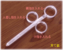 いちばん上の丸いわっかに親指を、下のふたつのわっかに人差し指と中指を入れて、