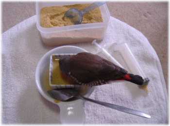 オカメの雛ちゃんのために作ってある挿し餌をつまみぐいし、